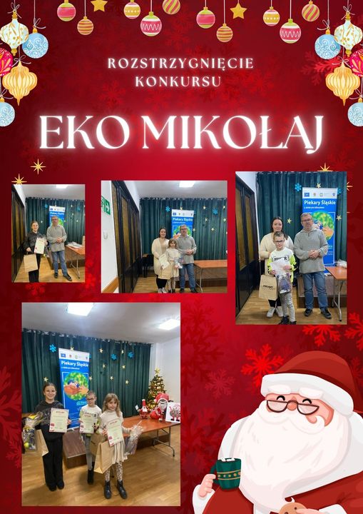 W dniu wczorajszym obyło się rozstrzygnięcie konkursu rękodzieła pn." Eko-Mikołaj". Zadaniem uczestników było stworzenie postaci Świętego Mikołaja z wykorzystaniem wyłącznie materiałów biodegradowalnych, naturalnych lub ekologicznych a jego celem było promowanie segregowania odpadów i zwrócenie uwagi na narastający problem zanieczyszczenia środowiska naturalnego odpadami. Konkurs był organizowany przez Dzielnicowy Dom Kultury w Brzezinach Śląskich przy współpracy z Ekodoradcą Gminnym Miasta Piekary Śląskie (Piekary Śląskie z dobrym klimatem w "Śląskie. Przywracamy błękit")