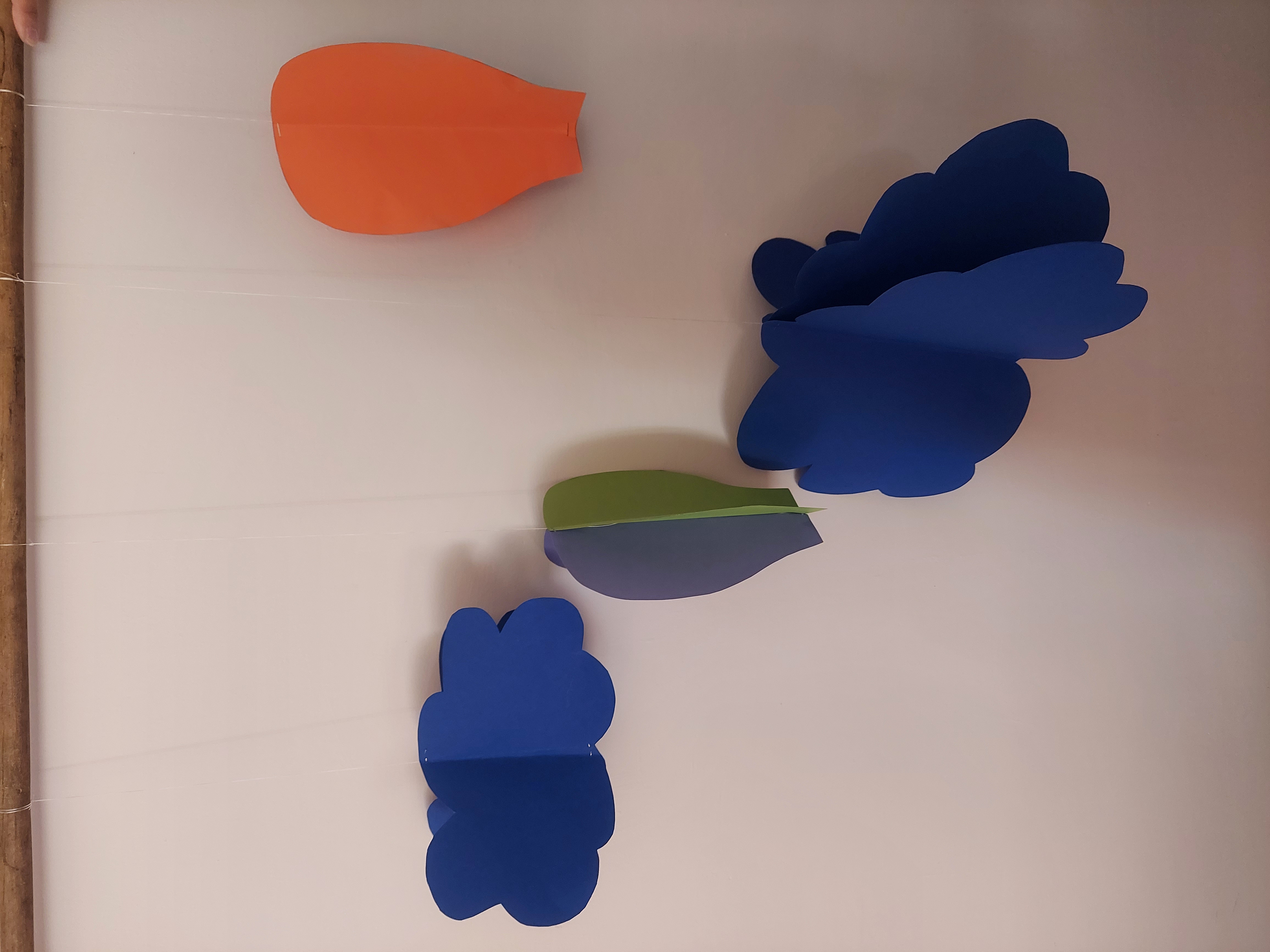 Przygotowane elementy zawieszamy w oknie lub nad łóżkiem, tak aby mogły się swobodnie kręcić.
